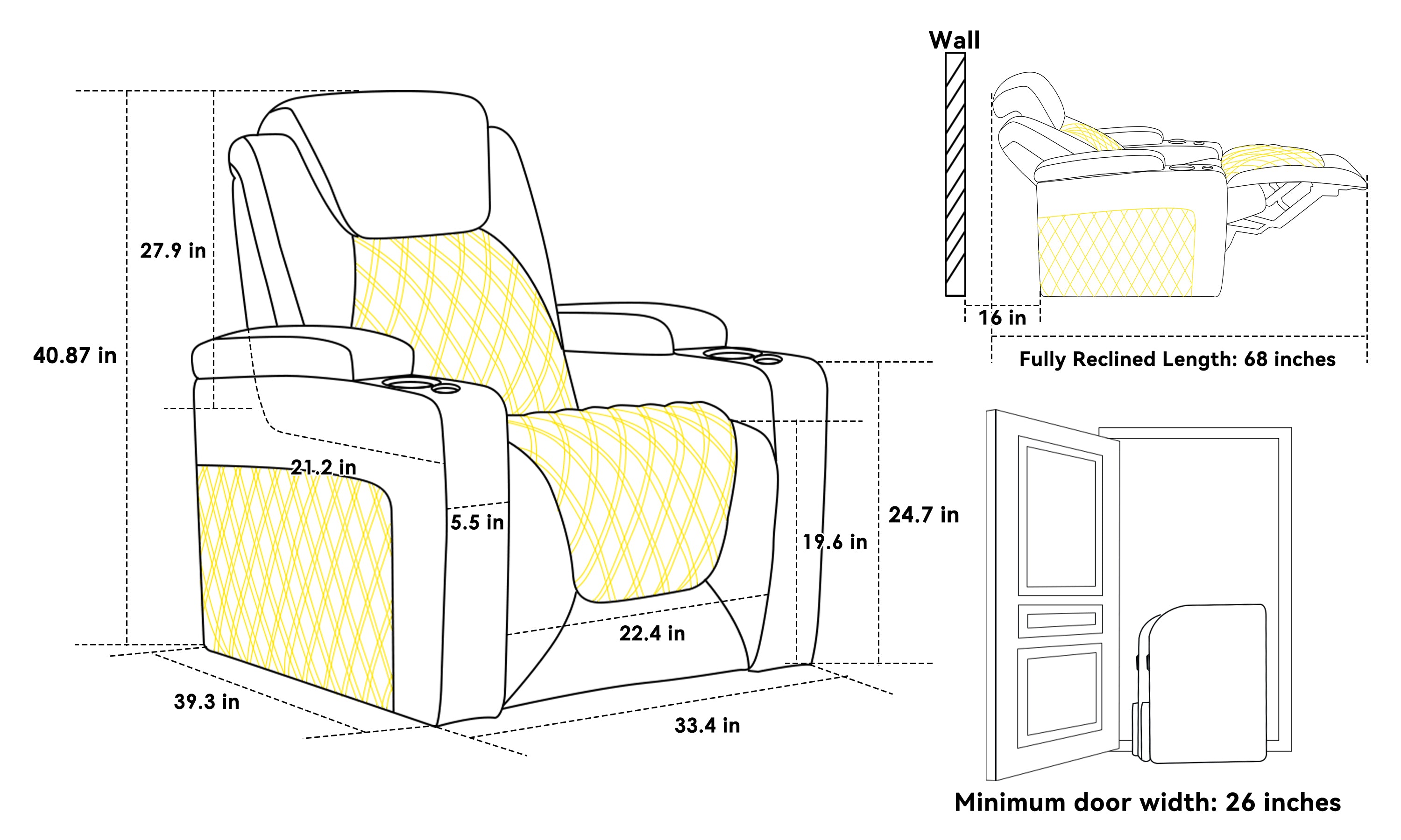 Before setup, please review the product dimensions carefully and compare them with your available space. Measure your room, doorways, hallways, and any pathways the chair will need to pass through to ensure a proper fit. Also, verify clearance requirements for full reclining operation—proper spacing ensures smooth movement, comfortable use, and long-term performance.